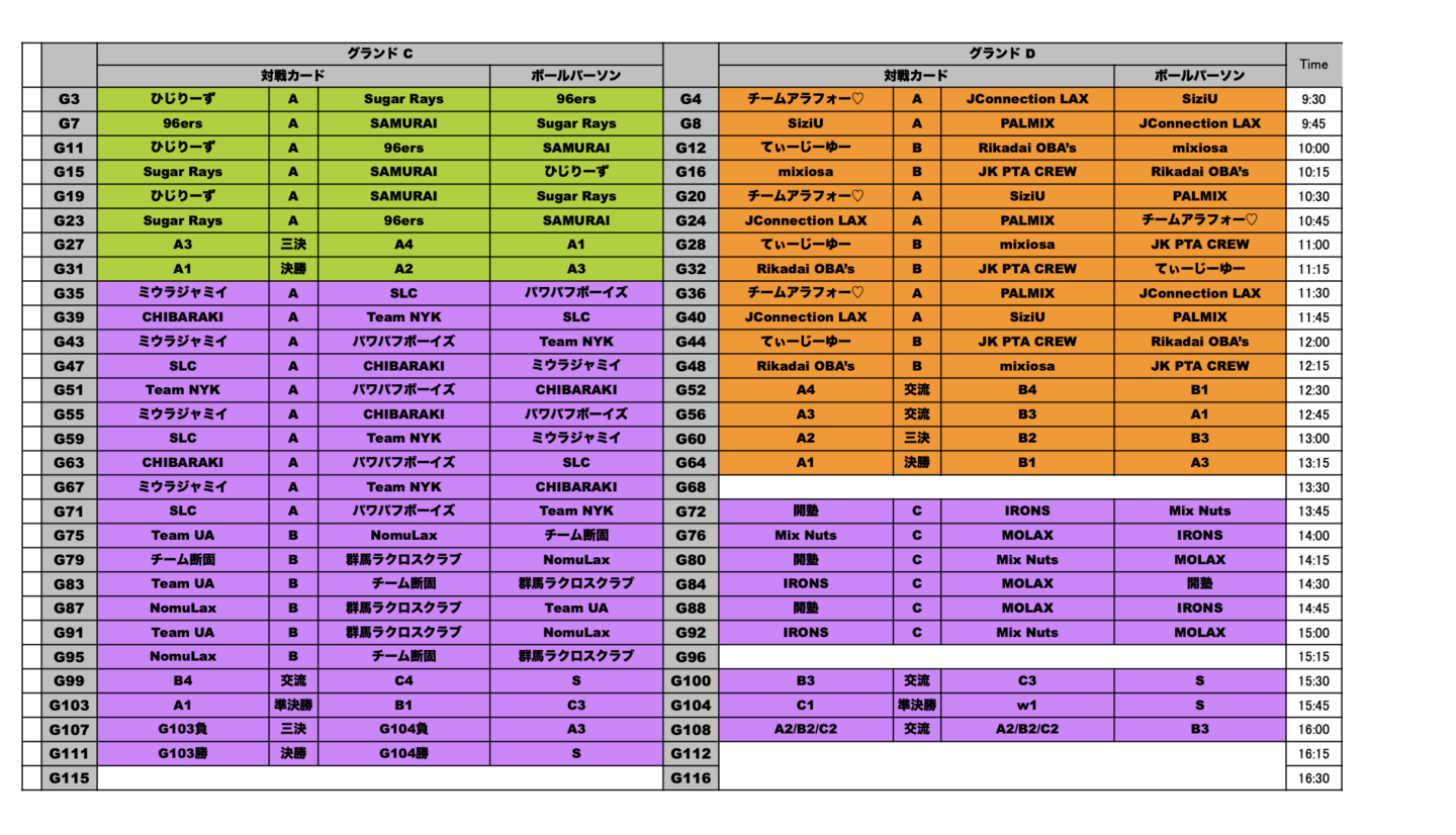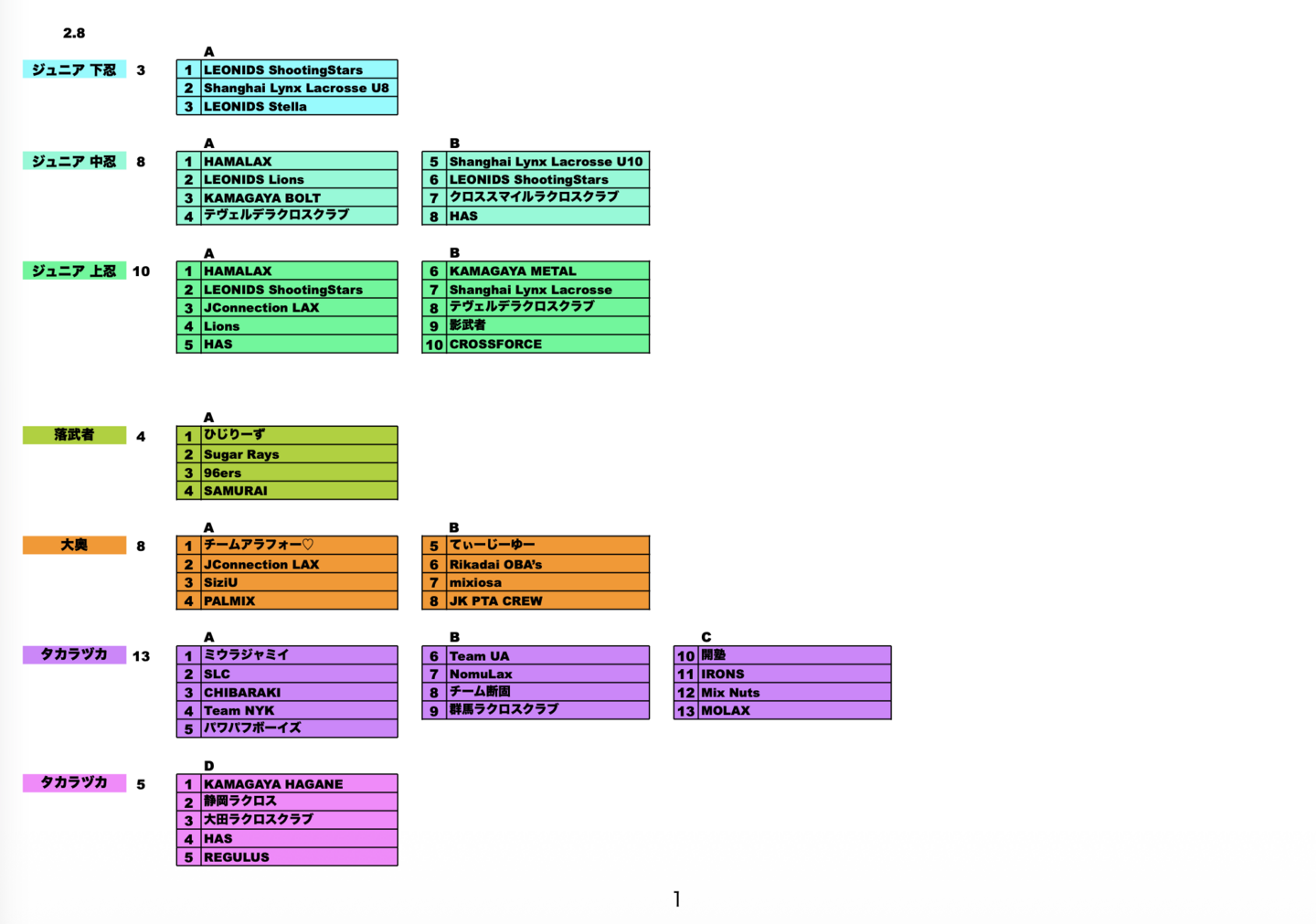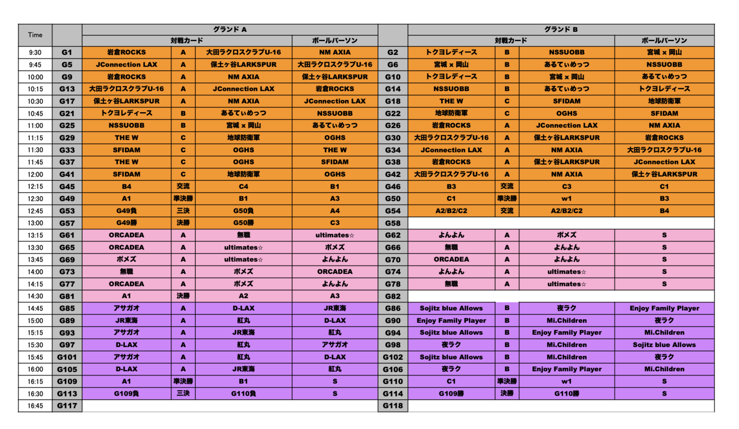 参加選手名、住所、電話番号、年齢、ラクロス歴は大会当日受付で提出してください。