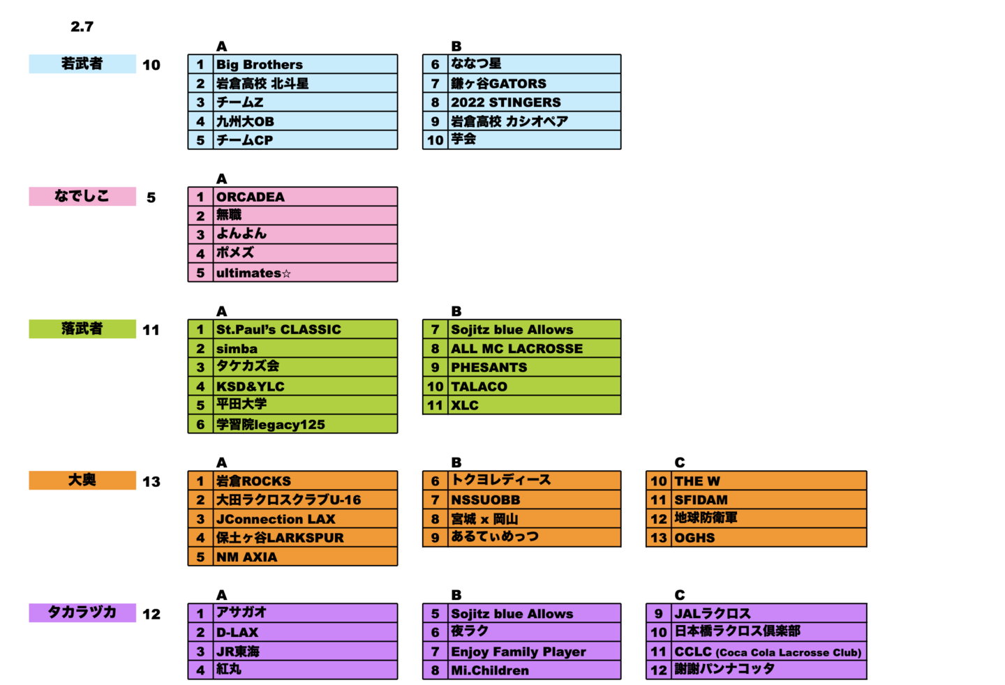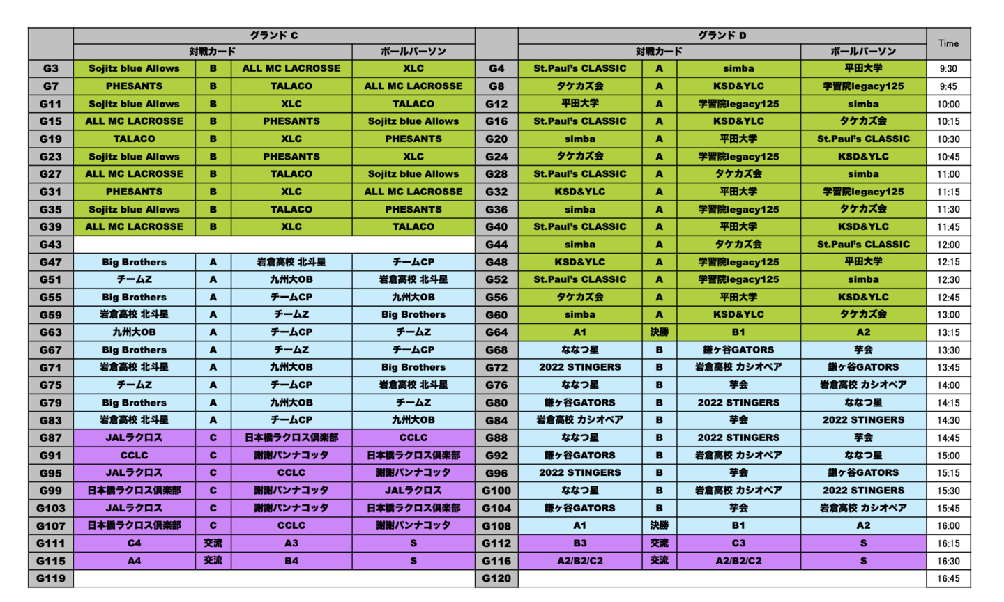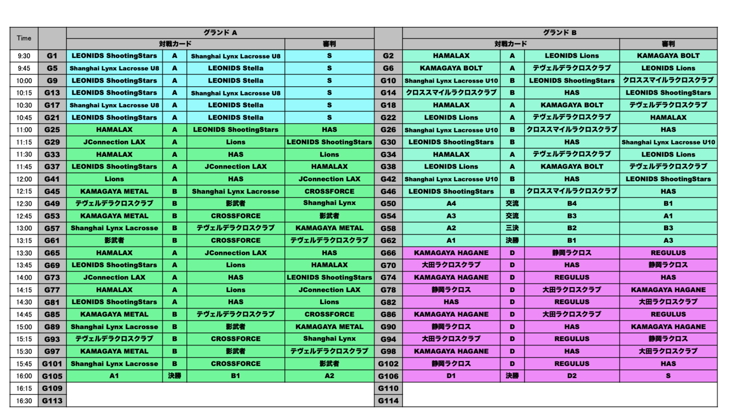 参加選手名、住所、電話番号、年齢、ラクロス歴は大会当日受付で提出してください。
